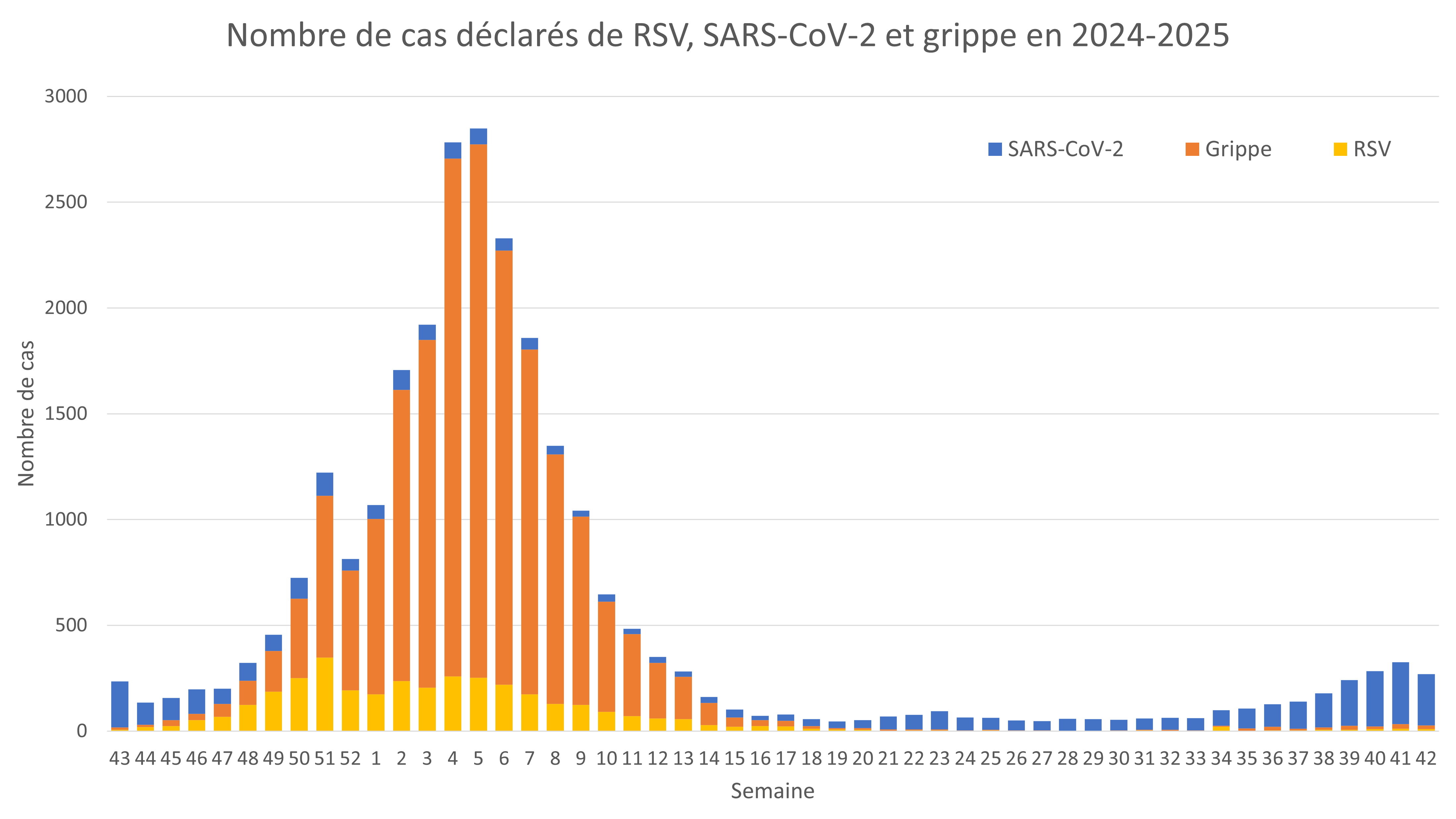 Pour le RSV, une légère diminution a été observée, avec 10 cas confirmés, contre 11 la semaine précédente.