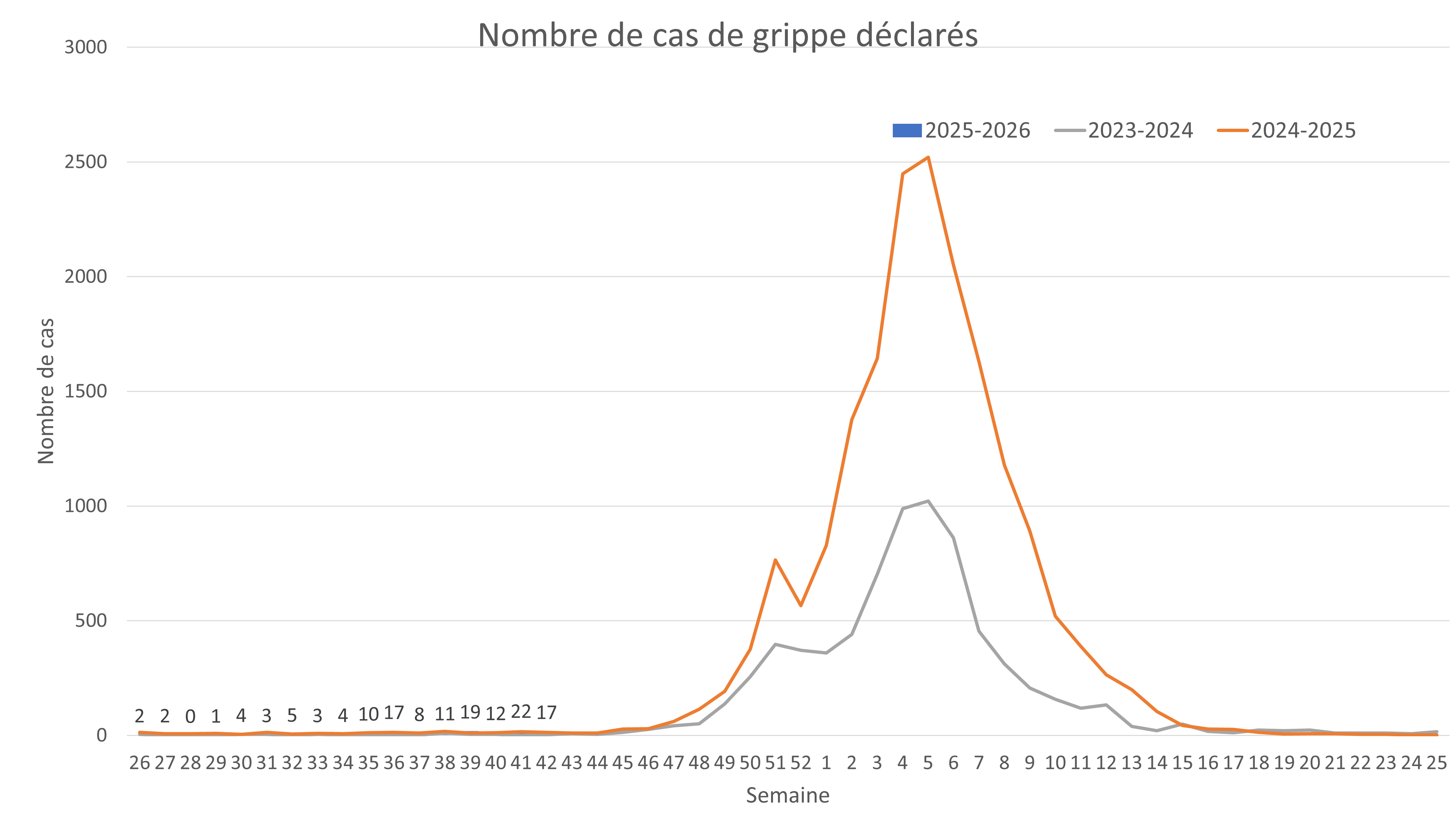 Au cours de la semaine 42, du 13 au 19 octobre 2025, le nombre de cas de grippe déclarés par les laboratoires a diminué légèrement, passant de 22 à 17 cas. Pendant la dernière semaine, il y a eu 94% de grippe A et 6% de grippe B parmi les résultats typés.