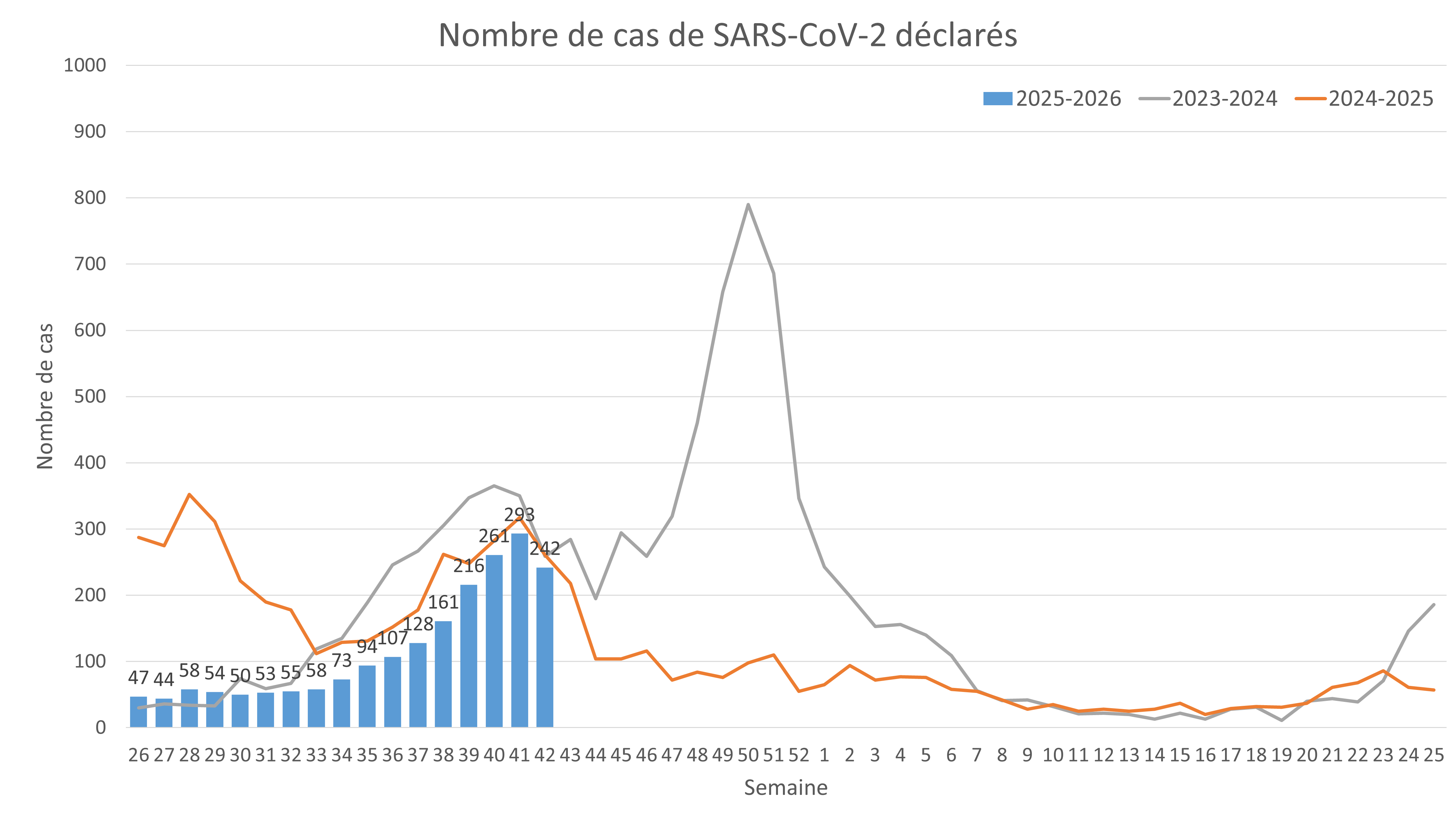 Au cours de la semaine 42, du 13 au 19 octobre 2025, le nombre de cas positifs au SARS-CoV-2 diminue, passant de 293 à 242 cas, soit une baisse de 17% par rapport à la semaine précédente. Cependant, la concentration virale détectée dans les eaux usées a augmenté.[1] Les dernières données de séquençage disponibles révèlent que le variant XFG (49.2%) et son sous-variant XFG.3 (33.5%) prédominaient en septembre.[2]