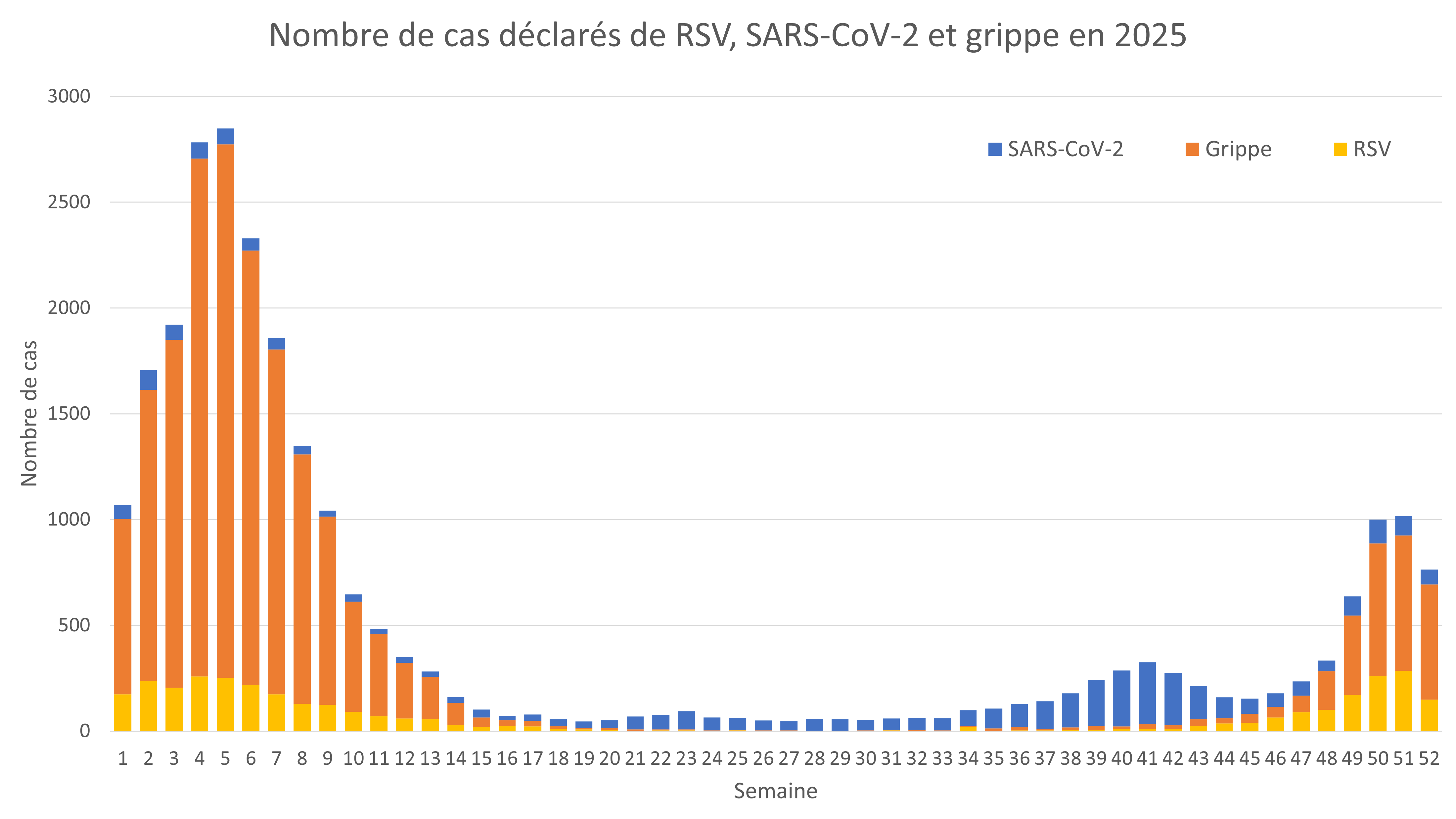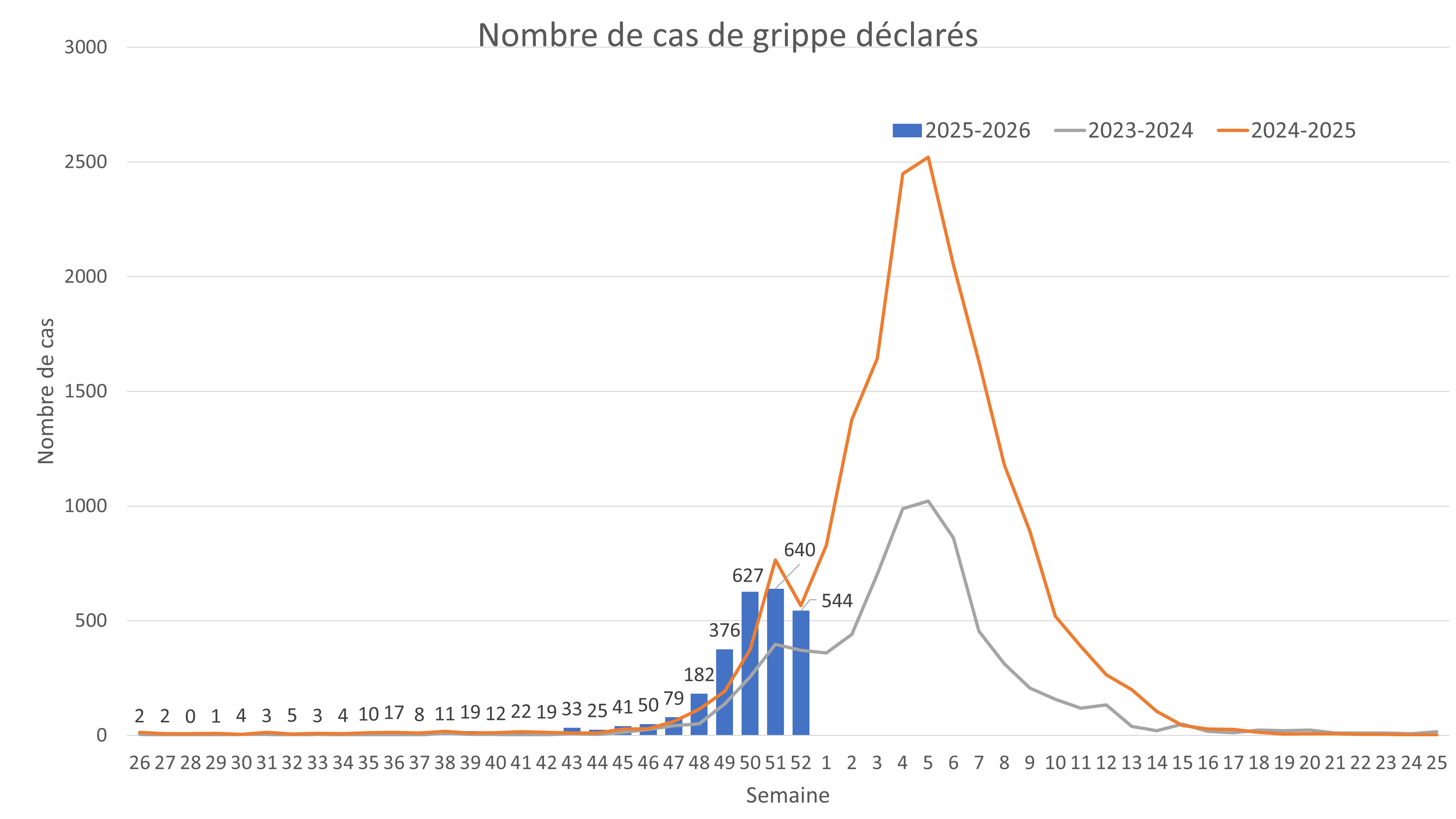 Au cours de la semaine 52, du 22 au 28 décembre 2025, le nombre de cas de grippe déclarés par les laboratoires a diminué passant de 640 à 544 cas, soit une baisse de 15% par rapport à la semaine précédente.