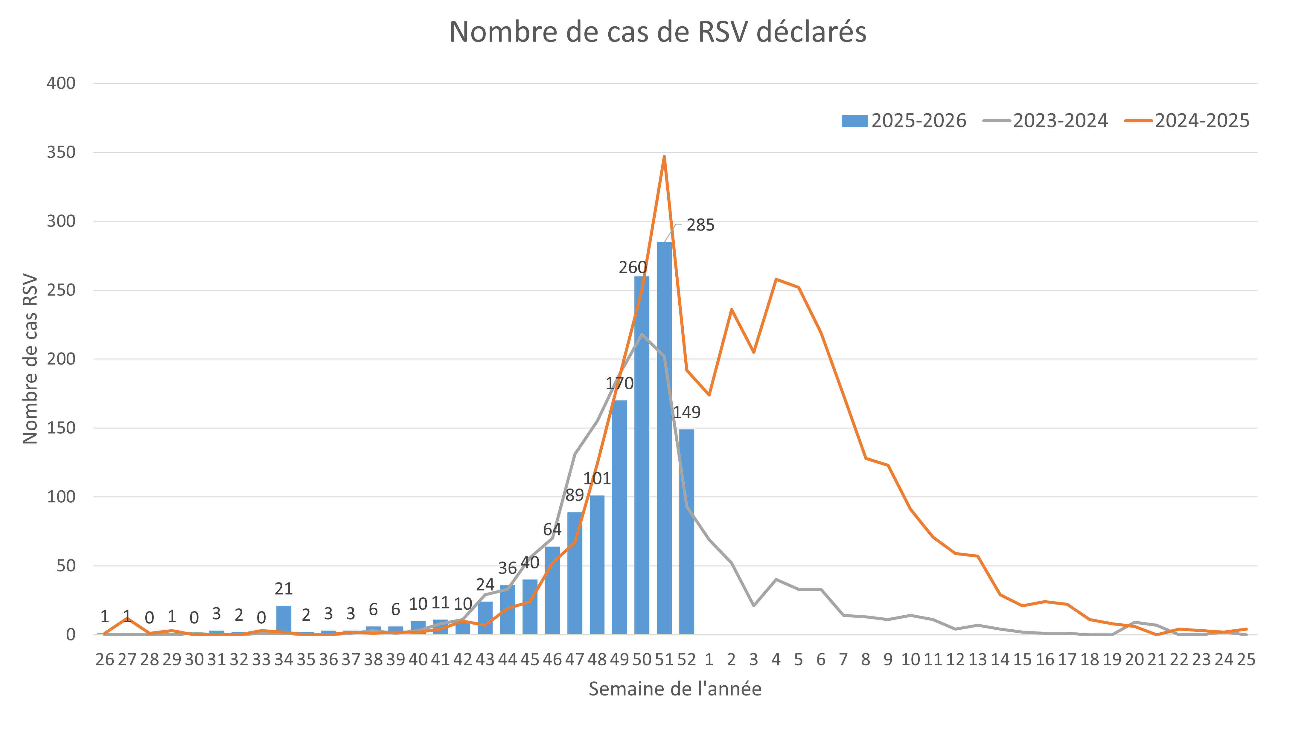 Pour le RSV, une diminution de 48% a été observée, avec 149 cas confirmés, contre 285 la semaine précédente. Depuis octobre 2025, 70% des infections concernent des enfants de moins de dix ans, ce qui indiquerait que le virus touche principalement les plus jeunes.
