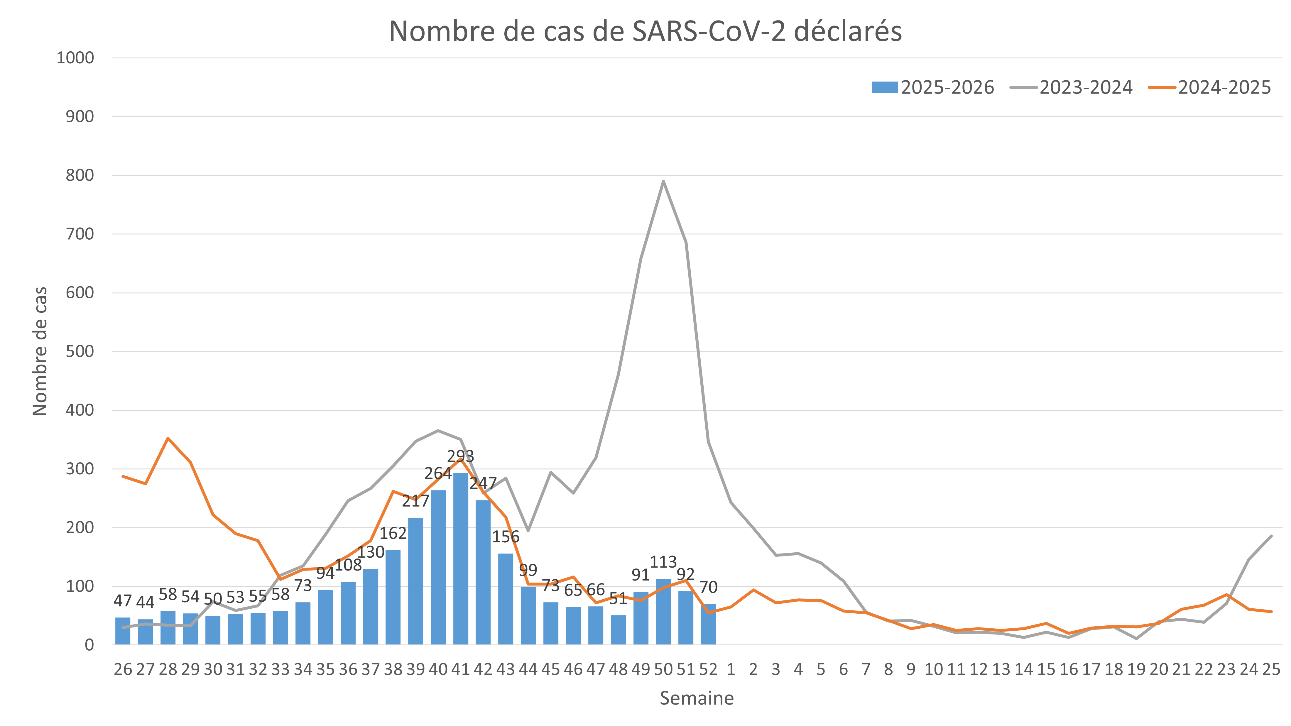 Au cours de la semaine 52, du 22 au 28 décembre 2025, le nombre de cas positifs au SARS-CoV-2 diminue, passant de 92 à 70 cas, soit une diminution de 24% par rapport à la semaine précédente.