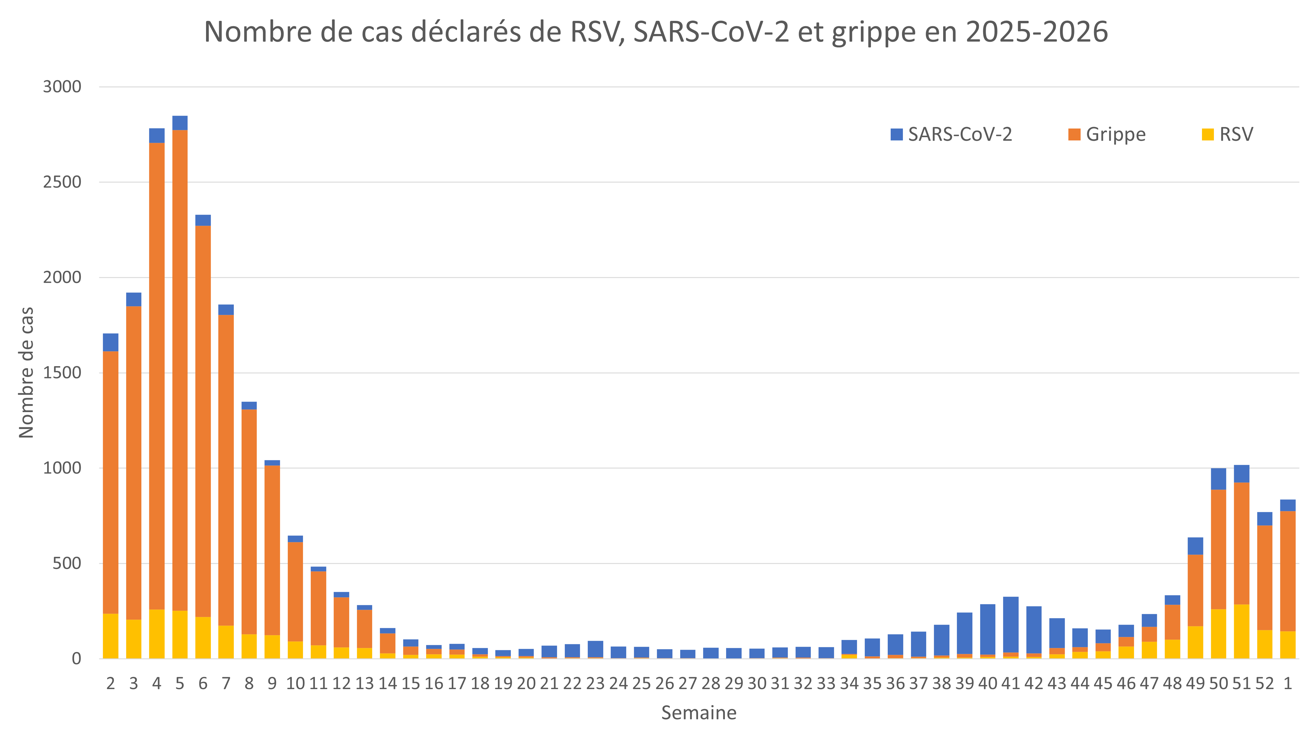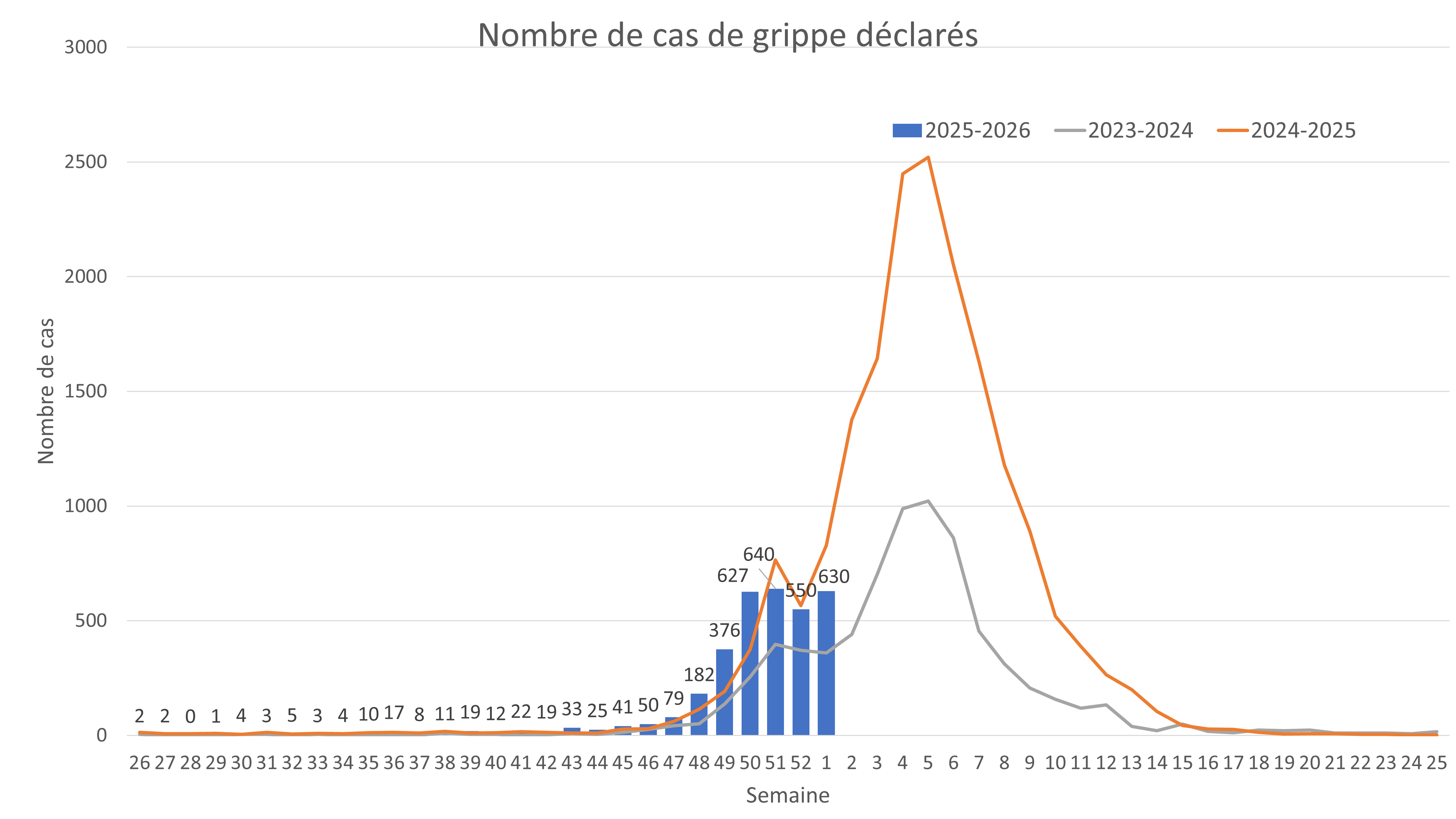 Au cours de la semaine du 29 décembre 2025 au 4 janvier 2026, le nombre de cas de grippe déclarés par les laboratoires a augmenté passant de 550 à 630 cas, soit une hausse de 15 % par rapport à la semaine précédente.