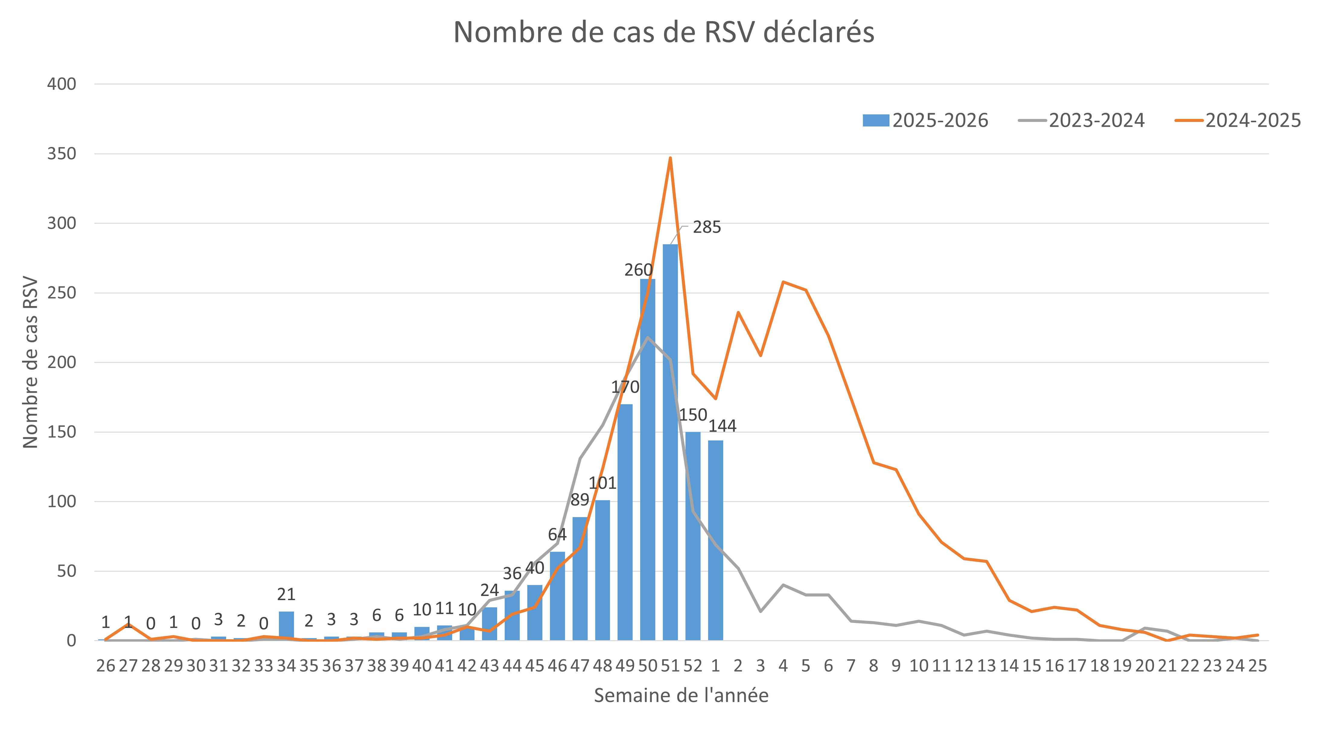 Pour le RSV, une légère diminution de 4 % a été observée, avec 144 cas confirmés, contre 150 la semaine précédente. Depuis octobre 2025, 68 % des infections concernent des enfants de moins de dix ans, ce qui indiquerait que le virus touche principalement les plus jeunes.